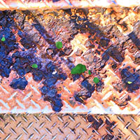 手すりや踏み板の裏側、接合部など普段あまり目につかない場所に赤茶色の錆が広がっている場合は、鉄骨内部まで腐食が進行している可能性があります。